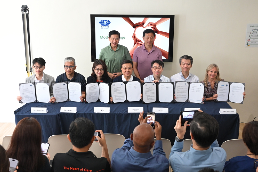 Tzu Chi exchanging MOUs with six partner organisations. Seated from left: Zacchaeus Chok, CEO & Co-Founder of Marymount Labs; Joseph Wee, Managing Director of Weeswares Pte Ltd; Jiang Ying, Assistant Professor, Alice Lee Centre for Nursing Studies, National University of Singapore; Low Swee Seh, CEO of Tzu-Chi Foundation (Singapore); Associate Professor Allan Chia, Deputy Provost, Singapore University of Social Sciences; Annika Wohlstrom, Sales Director of HUR Solutions; and Russell Chan, Principal & CEO of Nanyang Polytechnic. Standing behind as witnesses are MP Ang Wei Neng (left) and Minister Ong Ye Kung (right). (Photo by Wong Twee Hee)