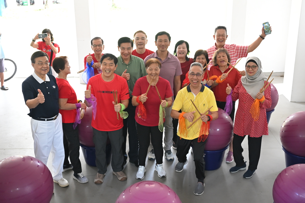 Energetic seniors welcomed the distinguished guests with a lively percussion performance using yoga balls and cheerfully posed for photos together afterward. (Photo by Wong Twee Hee)