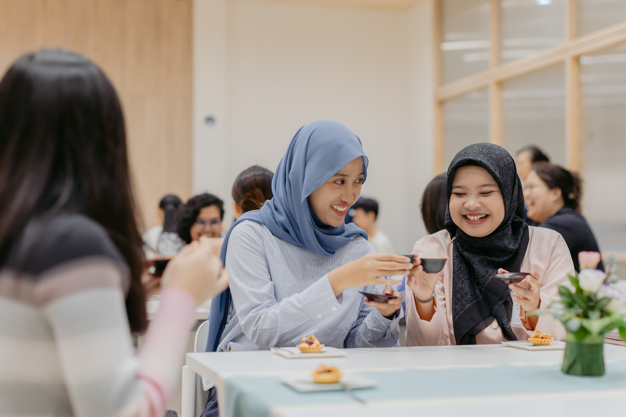 Natasya Pustika Siregar (right) and Bella Citra Hadini (left) signed up for a tea ceremony workshop to learn more about Chinese tea culture. (Photo by Donn Tan)