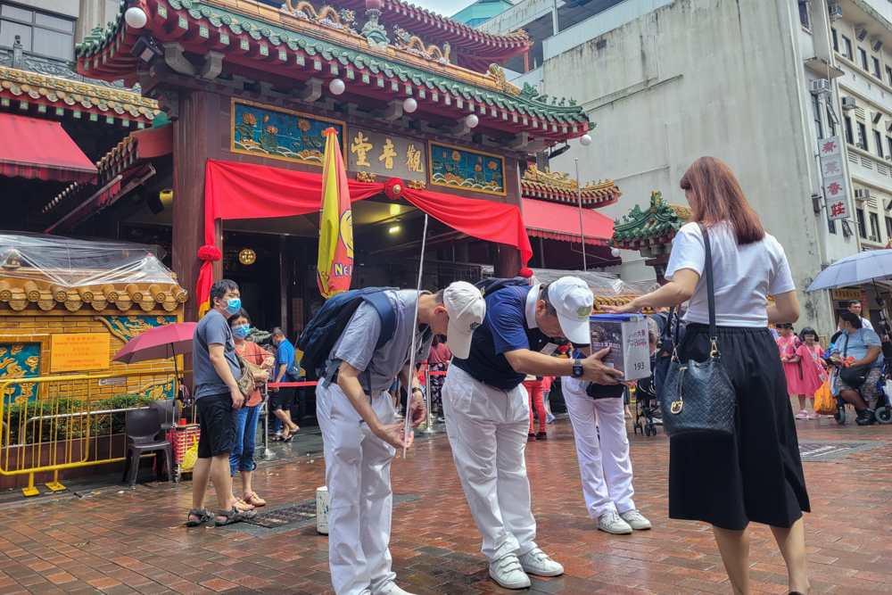 随着天气稍为放晴,街上的人流越来越多,志工呼吁捐款的声音更加洪亮,手中的爱心箱也越来越沉。